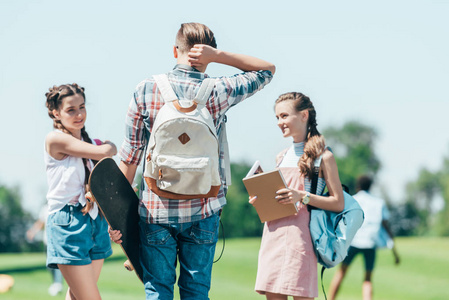 青少年在公园里站着说着书和滑板照片