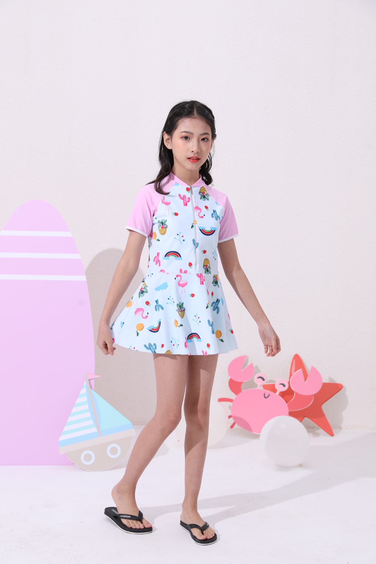 半袖儿童游泳衣女童防晒时尚拉链分体可爱中小大童三角泳装