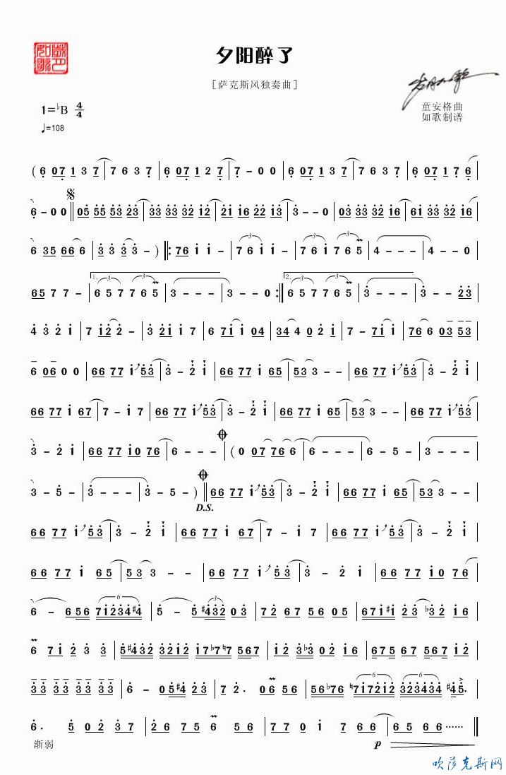 求夕阳醉了的萨克斯曲谱,我是萨克斯爱好者.