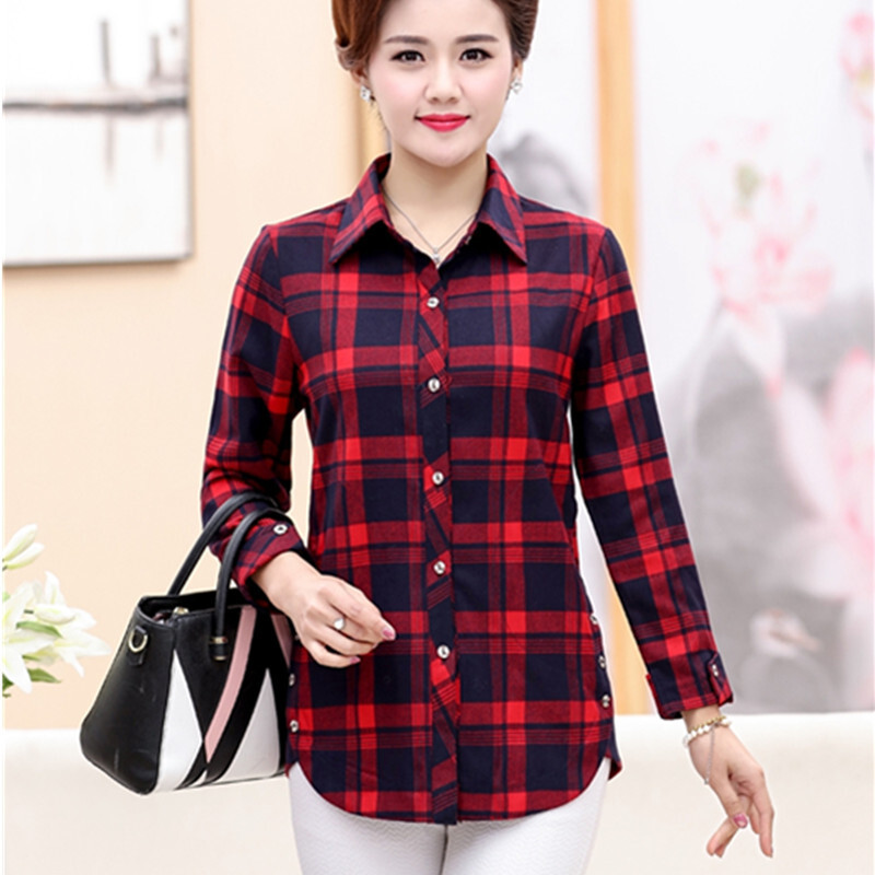 妈妈装春秋装长袖衬衣外套女中长款中老年人女装春季时尚格子衬衫