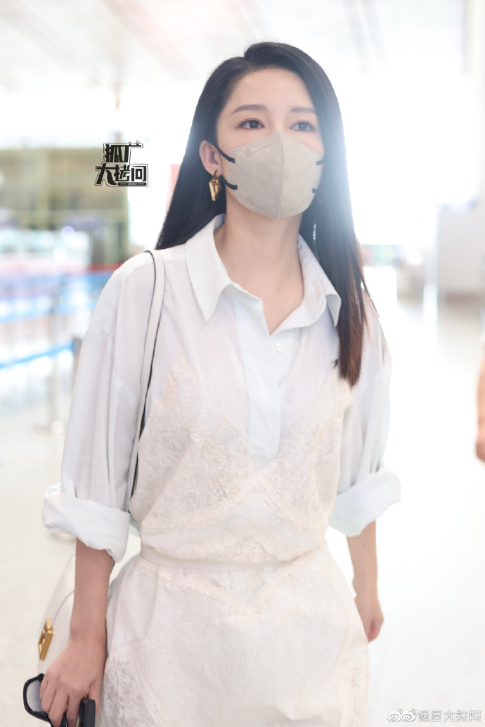 李沁白色衬衫裙机场出发图#李沁现身机场,一身白色束腰衬衫裙,清新又