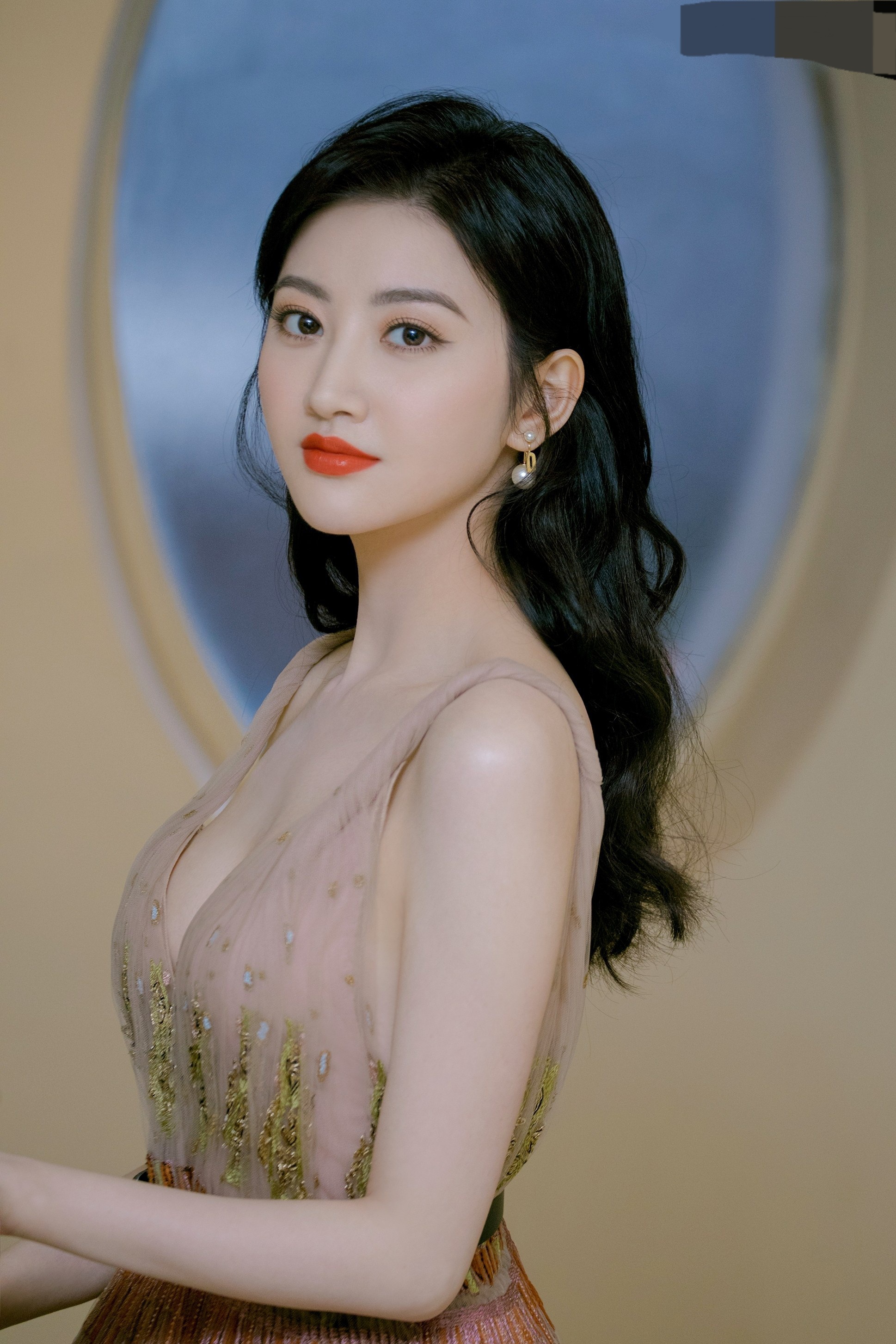 这组粉色深v礼服景甜事业线外露,纤细的腰,修长的手臂,冰肌玉骨的美人