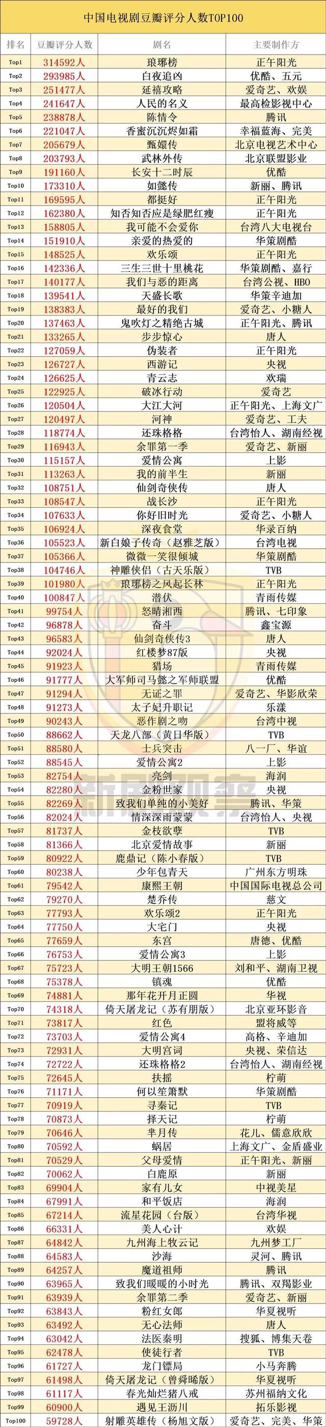 中国电视剧豆瓣评分人数top100,8部剧集豆瓣评分人数超20万人