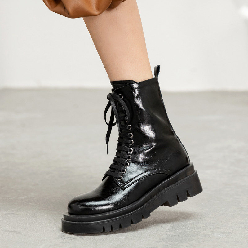 真皮绑带靴子增高圆头短靴复古马丁靴女潮ins酷工装靴厚底机车靴