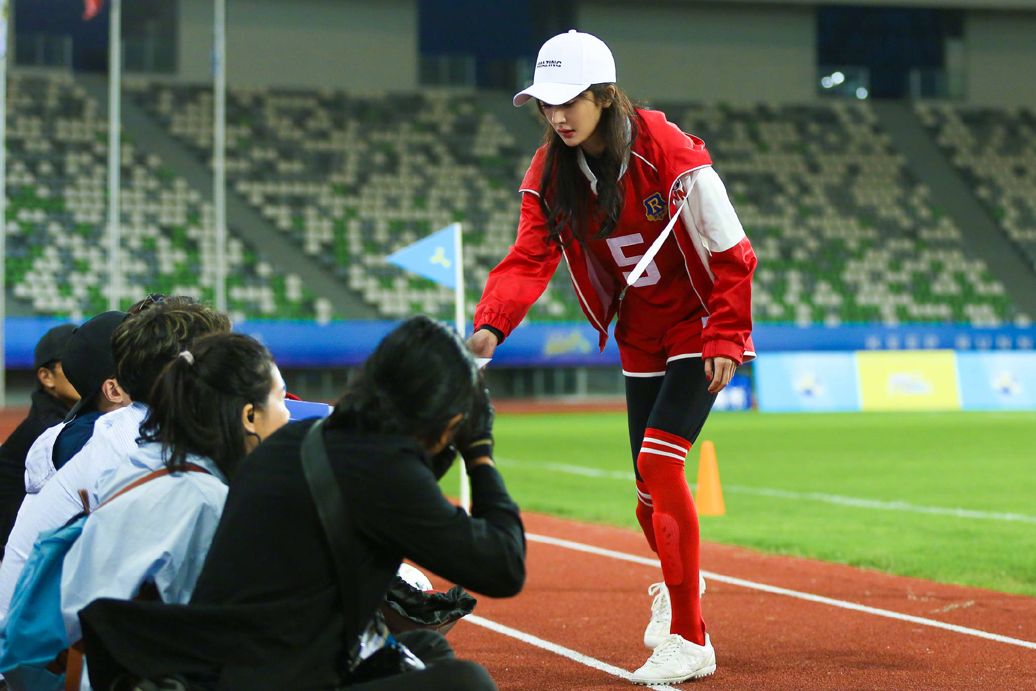 奔跑吧# 绿茵场上一抹红!杨幂 一身红.