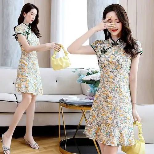 叶余旗袍女连衣裙子中国风 新款改良旗袍连衣裙碎花夏季修身气质中长