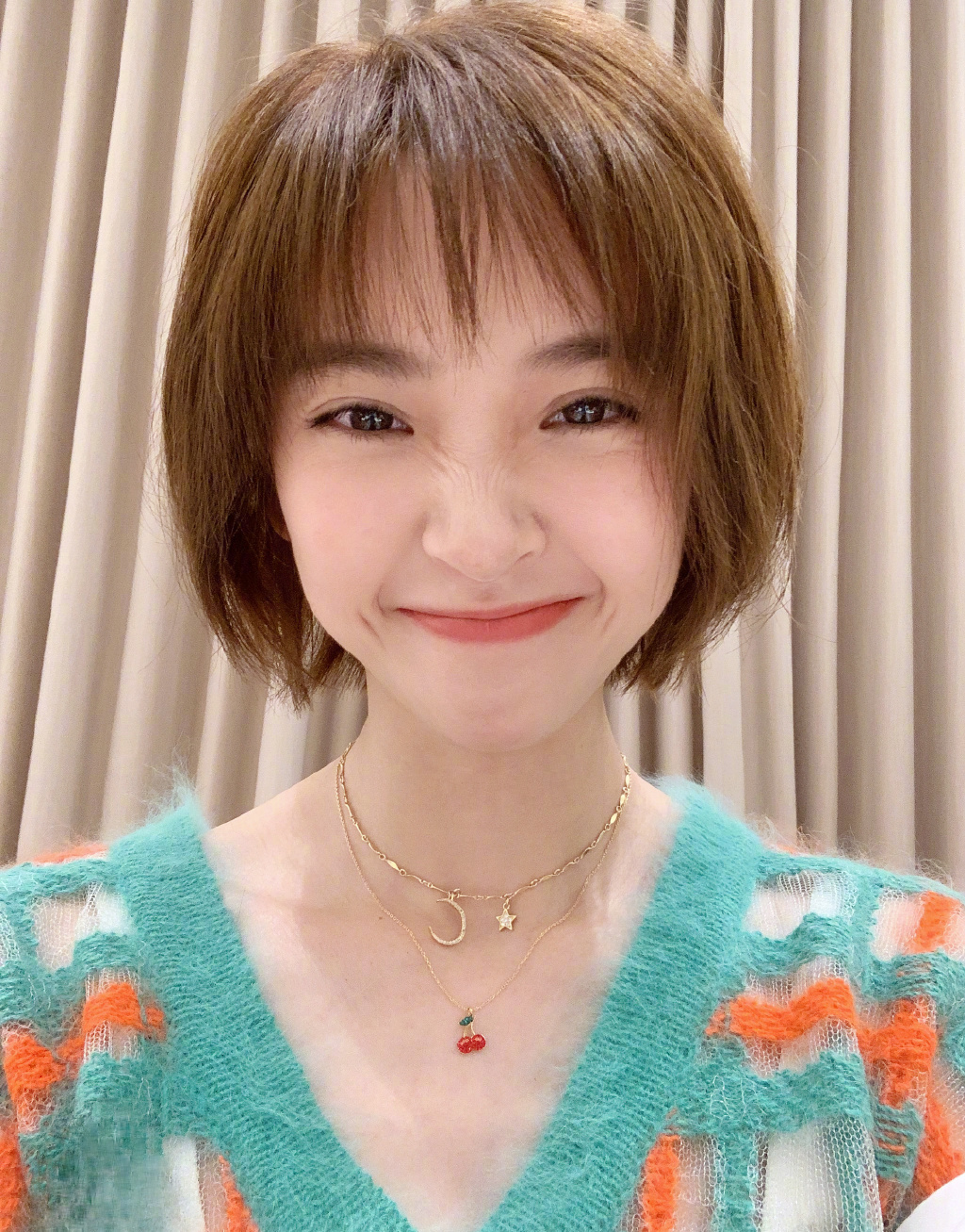 唐艺昕终于换发型法式短发搭配绿色毛衣气质都变了