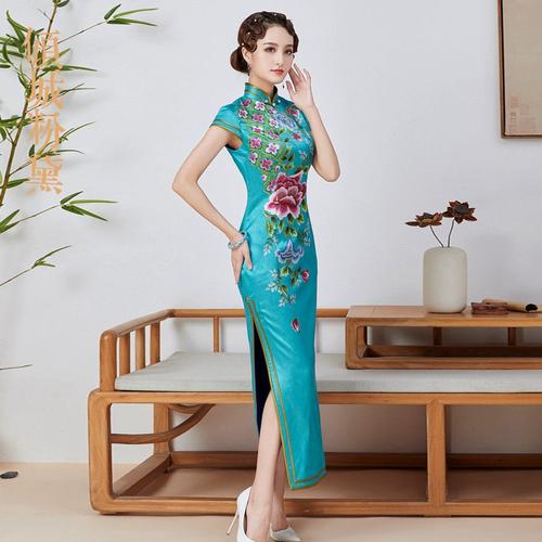 真丝旗袍高端长款少女款2022新款仿杭州夏季复古走秀演出中国风气质