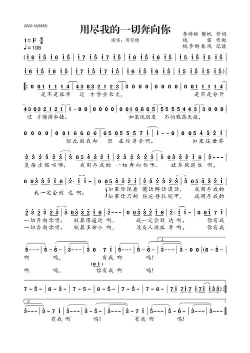 用尽我的一切奔向你 周笔畅 歌谱 简谱