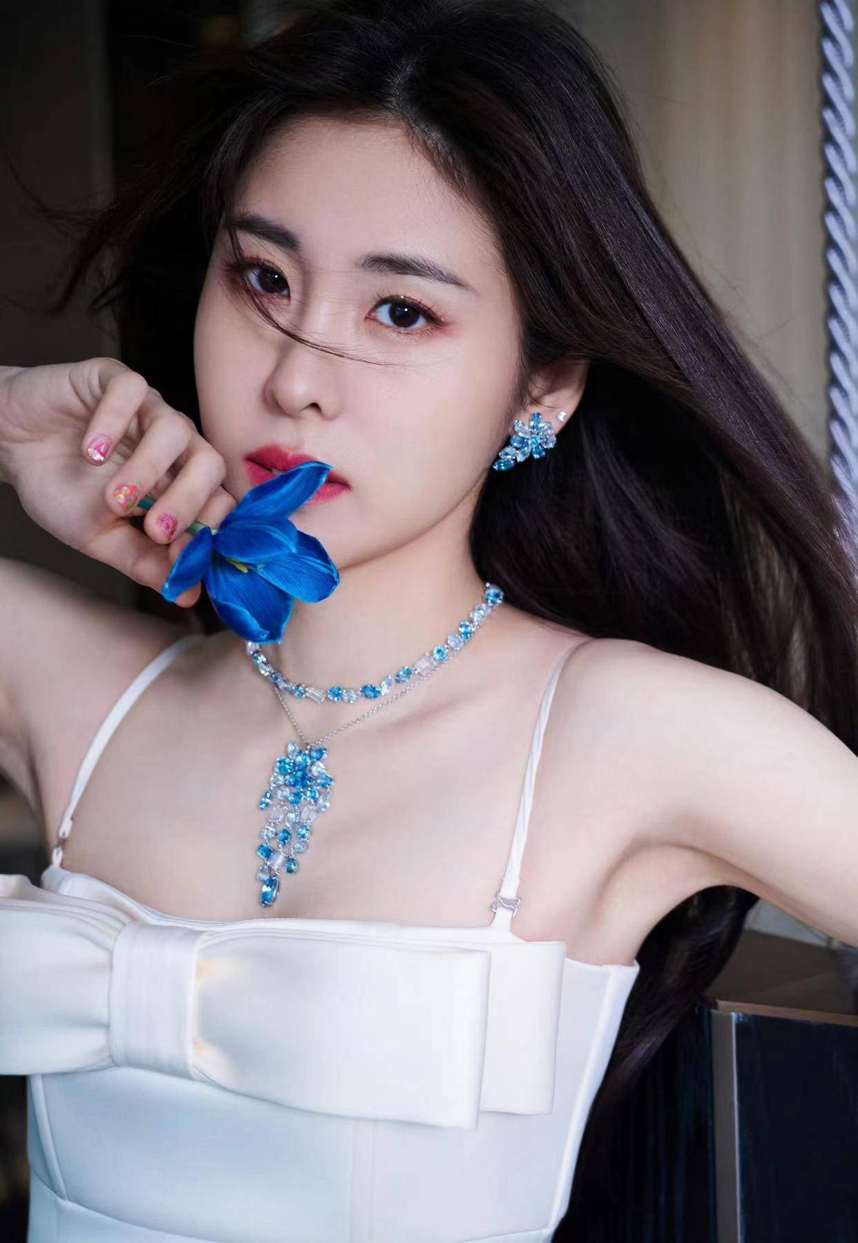 张碧晨蓝色绒面礼服下,高挑身材配玉足,宛如"蓝天白云"的清新.