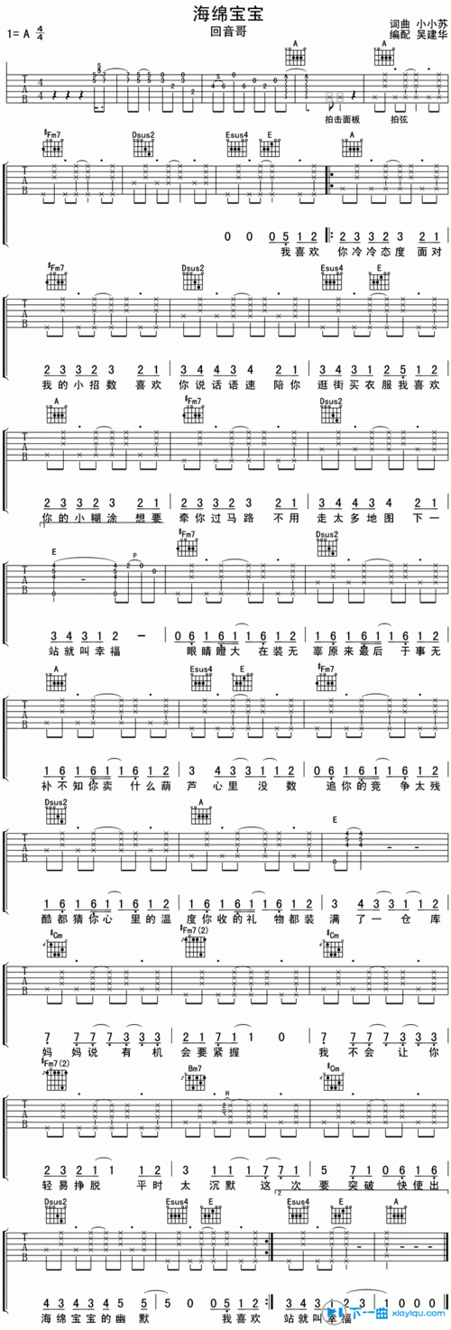 海绵宝宝吉他谱 六线谱a调和弦编配_回音哥