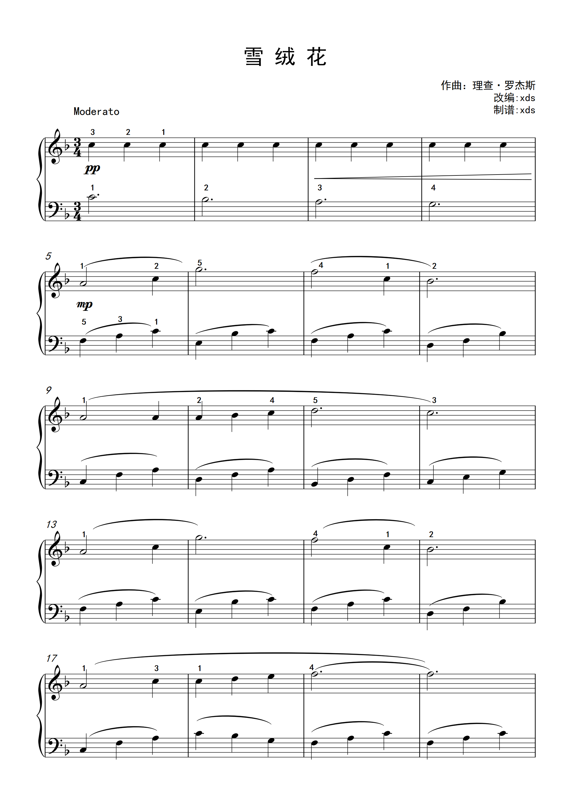 钢琴谱 - 《雪绒花》带指法,初学适用,配六种伴奏形式