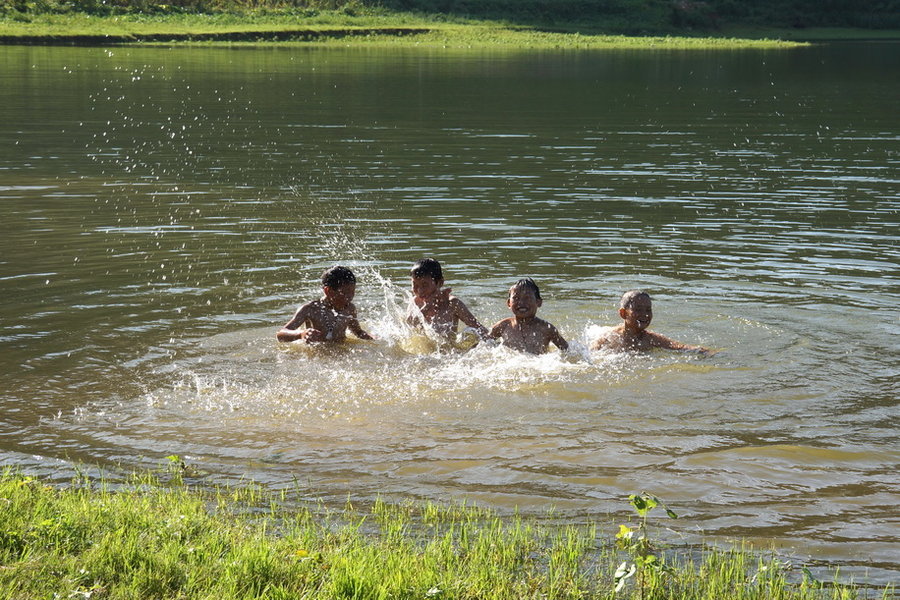 每到农历四月中的傍晚前,河里便会聚集一群光着臀腚的顽童在戏水茨种