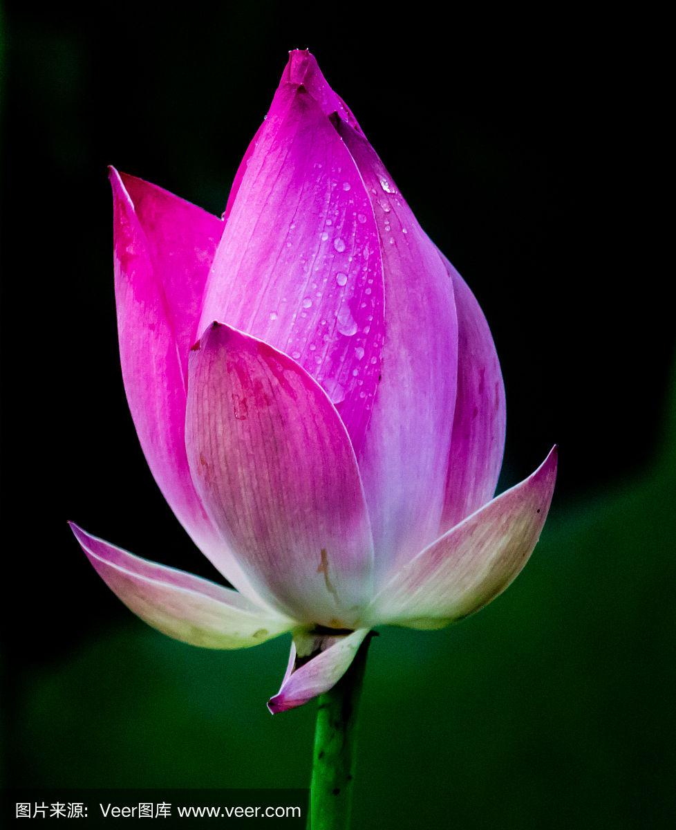 一朵带露珠的荷花在清晨绽放