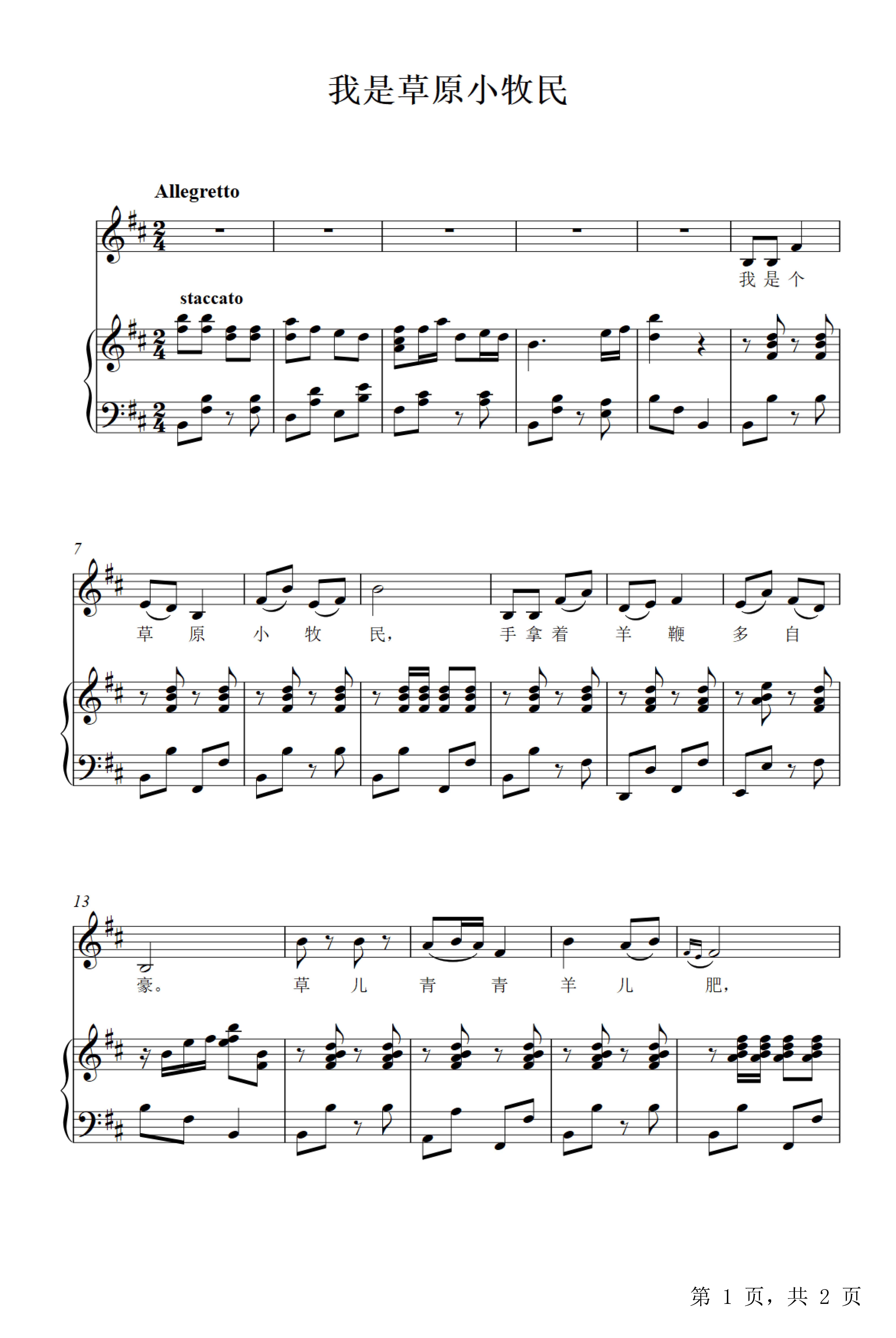 我是草原小牧民 钢琴伴奏 钢琴谱,歌谱 简谱,五线谱