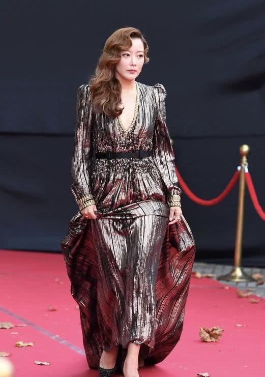 金喜善气质开挂,卷发造型搭配连衣裙走红毯高级大气,魅力十足