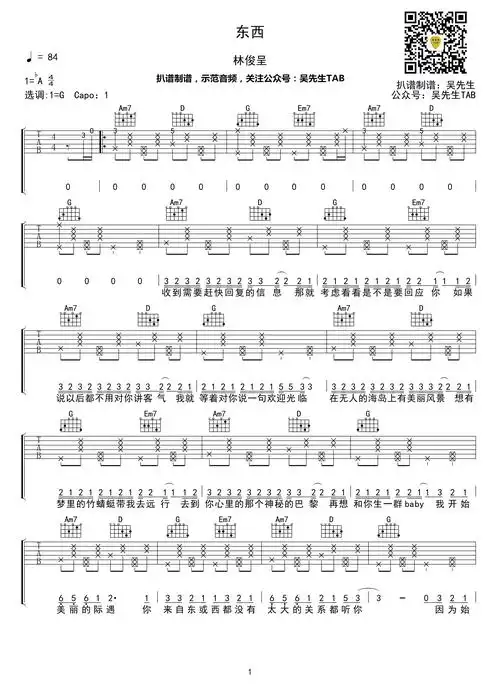 林俊呈《东西》吉他谱 g调指法高清弹唱谱