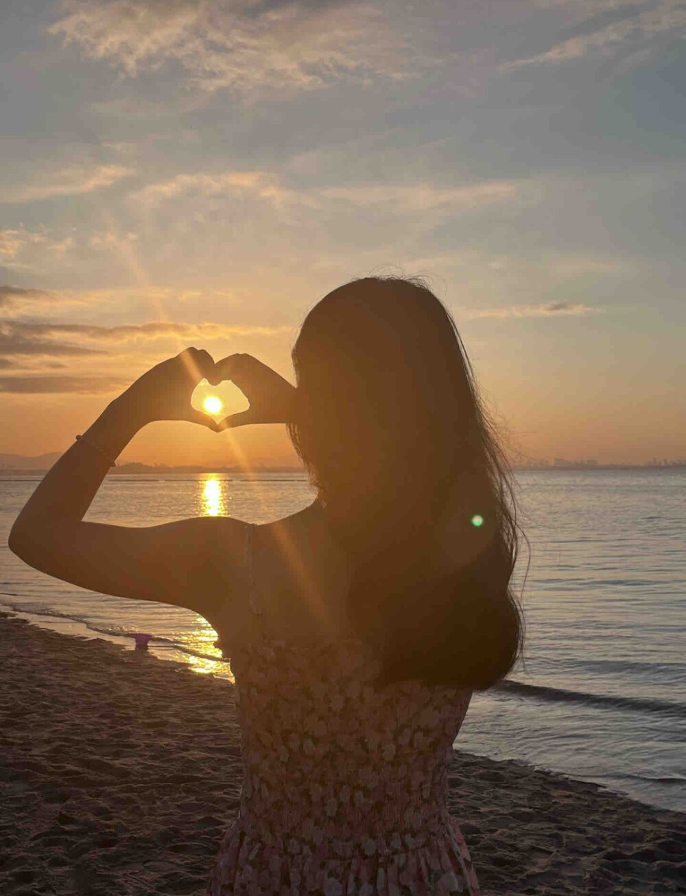 一直玩到傍晚的胡杏儿整个人依旧精力充沛,面对夕阳比心拍下背影中