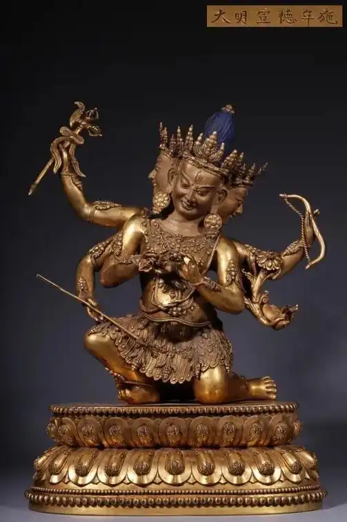 大明宣德年施"铜鎏金三面六臂叶衣佛母造像 高54厘米,长39 - 抖音