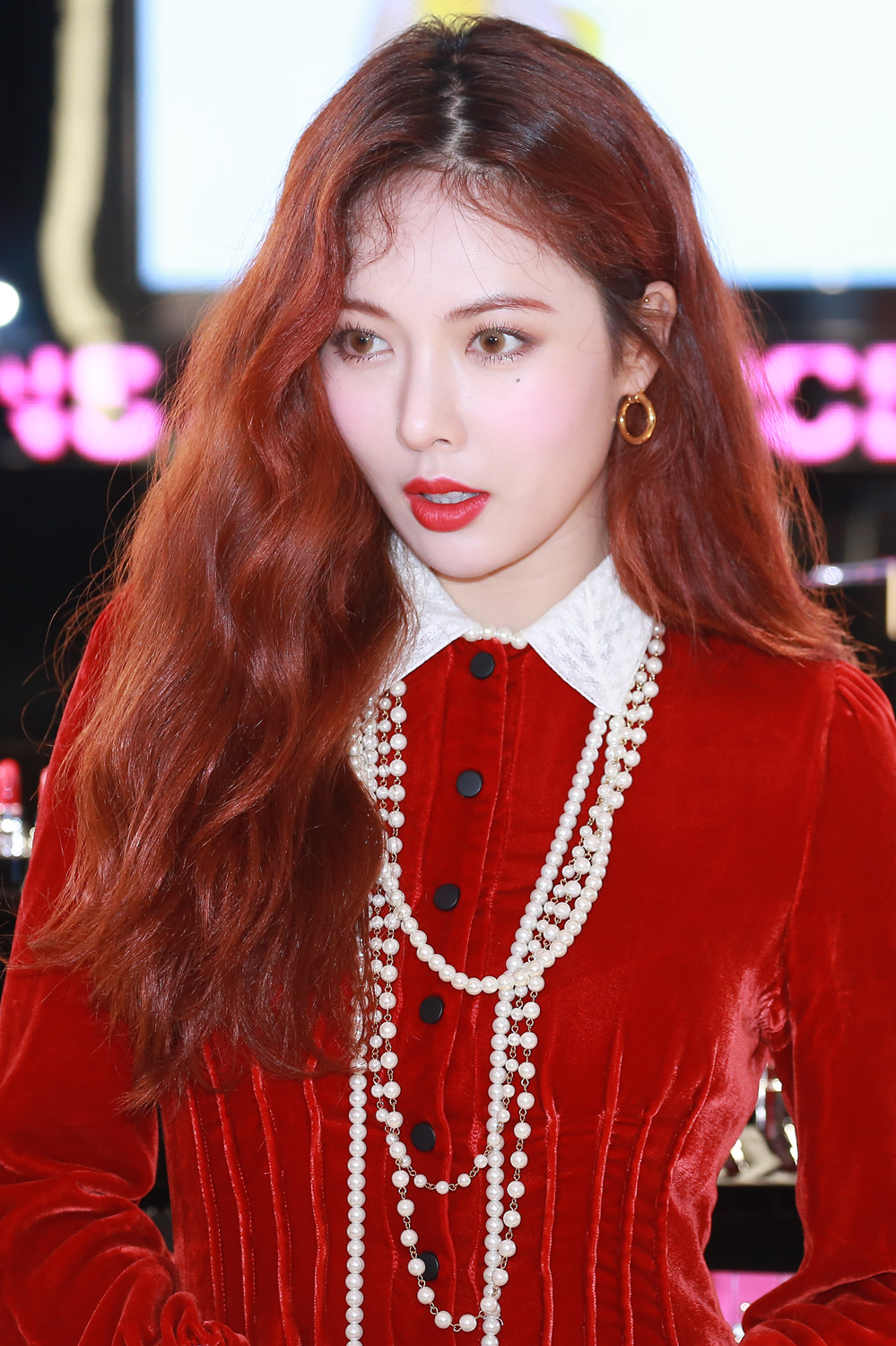 泫雅貌似偏爱浓妆艳抹,一头栗红色的长发搭配烈焰红唇,浑身向外散发