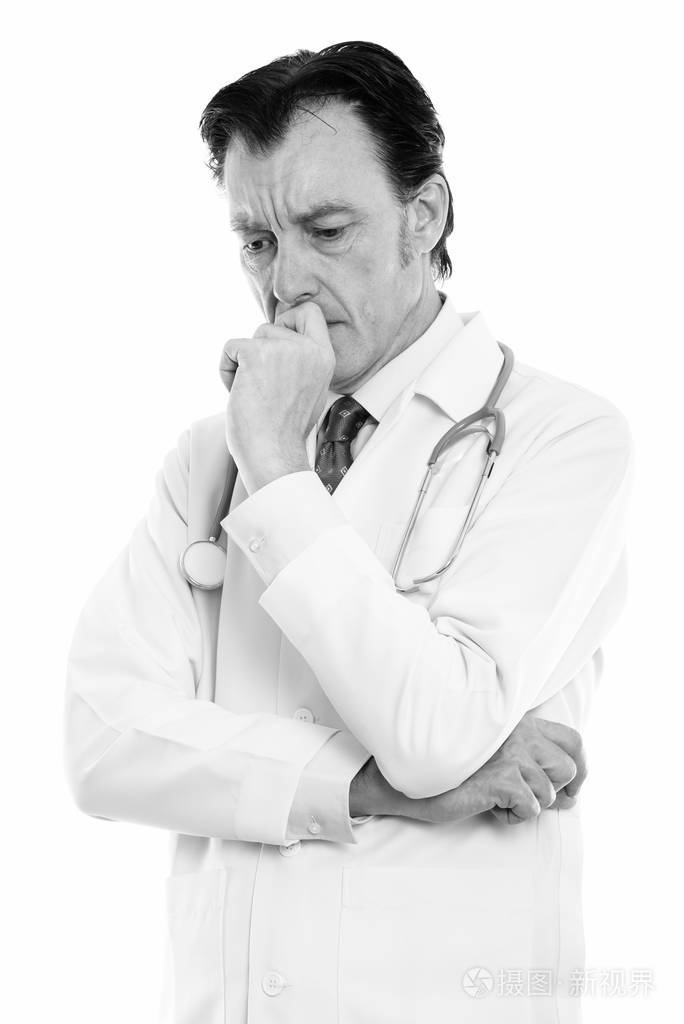 摄影棚拍摄成熟帅哥医生低头思考