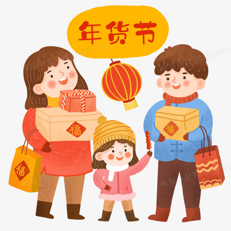 手绘卡通春节一家人买年货免抠元素