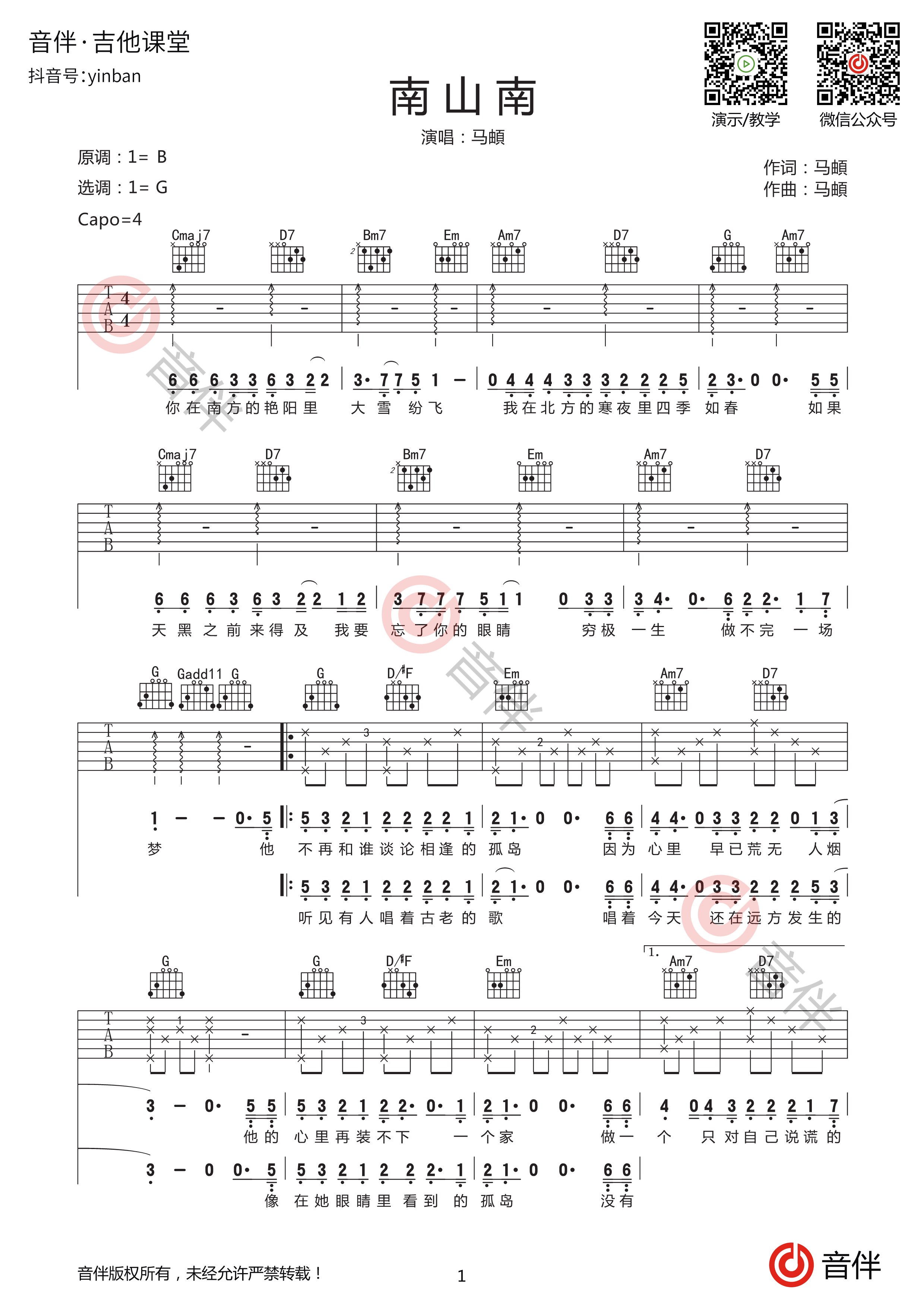 南山南吉他谱_马頔_g调原版弹唱吉他谱1