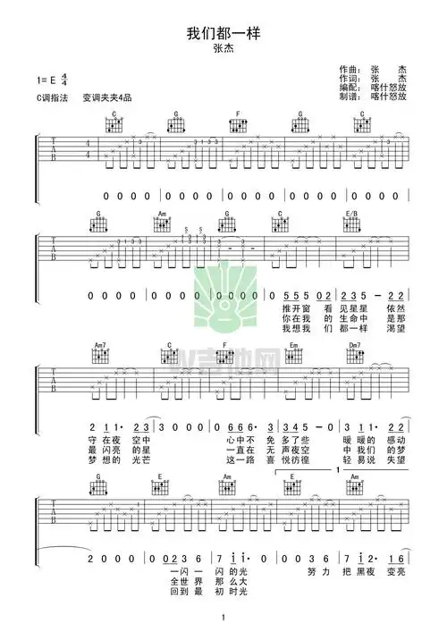 我们都一样吉他谱d调弹唱六线谱高清图片谱张杰