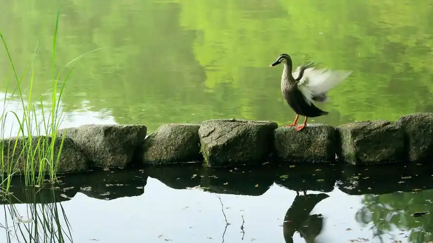 鸭子小鸭翅膀欢快池塘石头自然图片动物壁纸