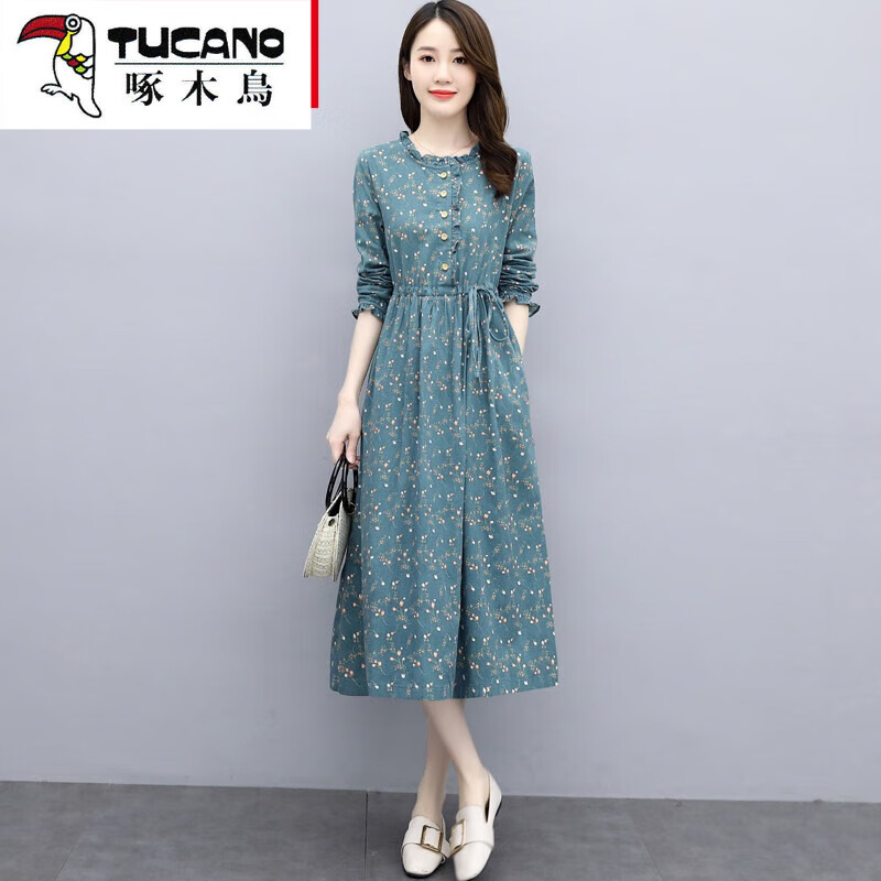 啄木鸟(tucano) 初秋碎花棉麻连衣裙2021秋冬新品气质系带显瘦打底