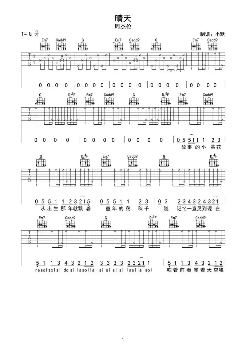 周杰伦《晴天》吉他谱_g调精细版_吉他弹唱谱1