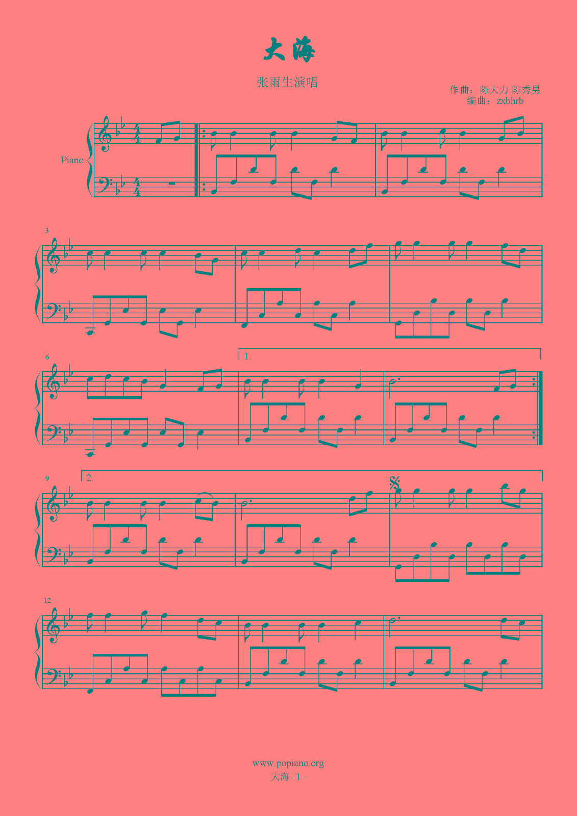 大海钢琴谱张雨生