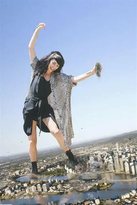 女巨人横跨城市,拿芭蕉树当扇子