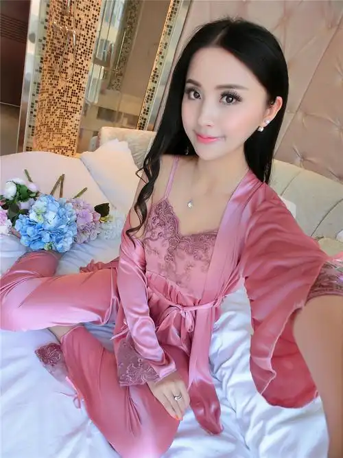 热销真丝睡衣三件_春秋季真丝性感睡衣女丝绸女士秋吊带睡裙长袖冰丝