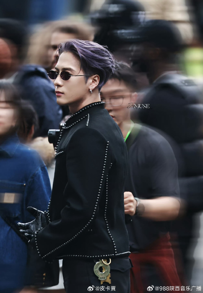 王嘉尔紫发看秀##王嘉尔巴黎时装周#@王嘉尔亮相巴黎时装周,紫色发型
