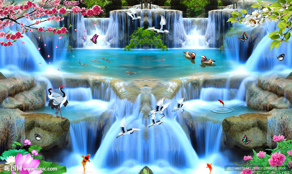 巍峨大气林间山谷鸟语花香瀑布背图片