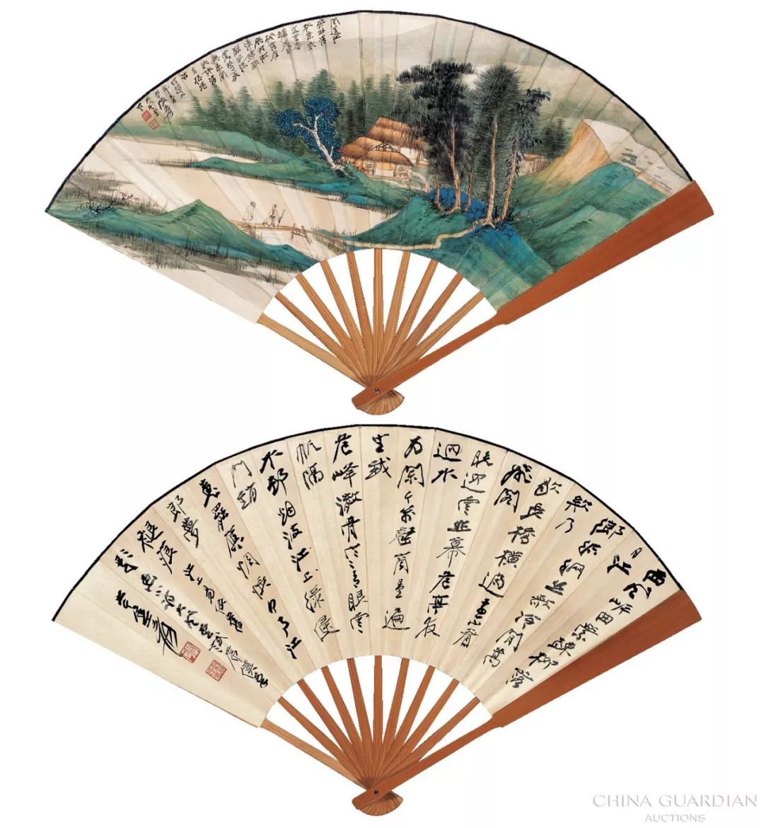张大千谢无量 1940年作 独往秋山·行书成扇 成扇 设色纸本