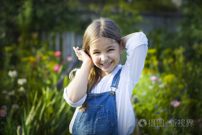 快乐微笑的小女孩,在阳光明媚的花园里的肖像