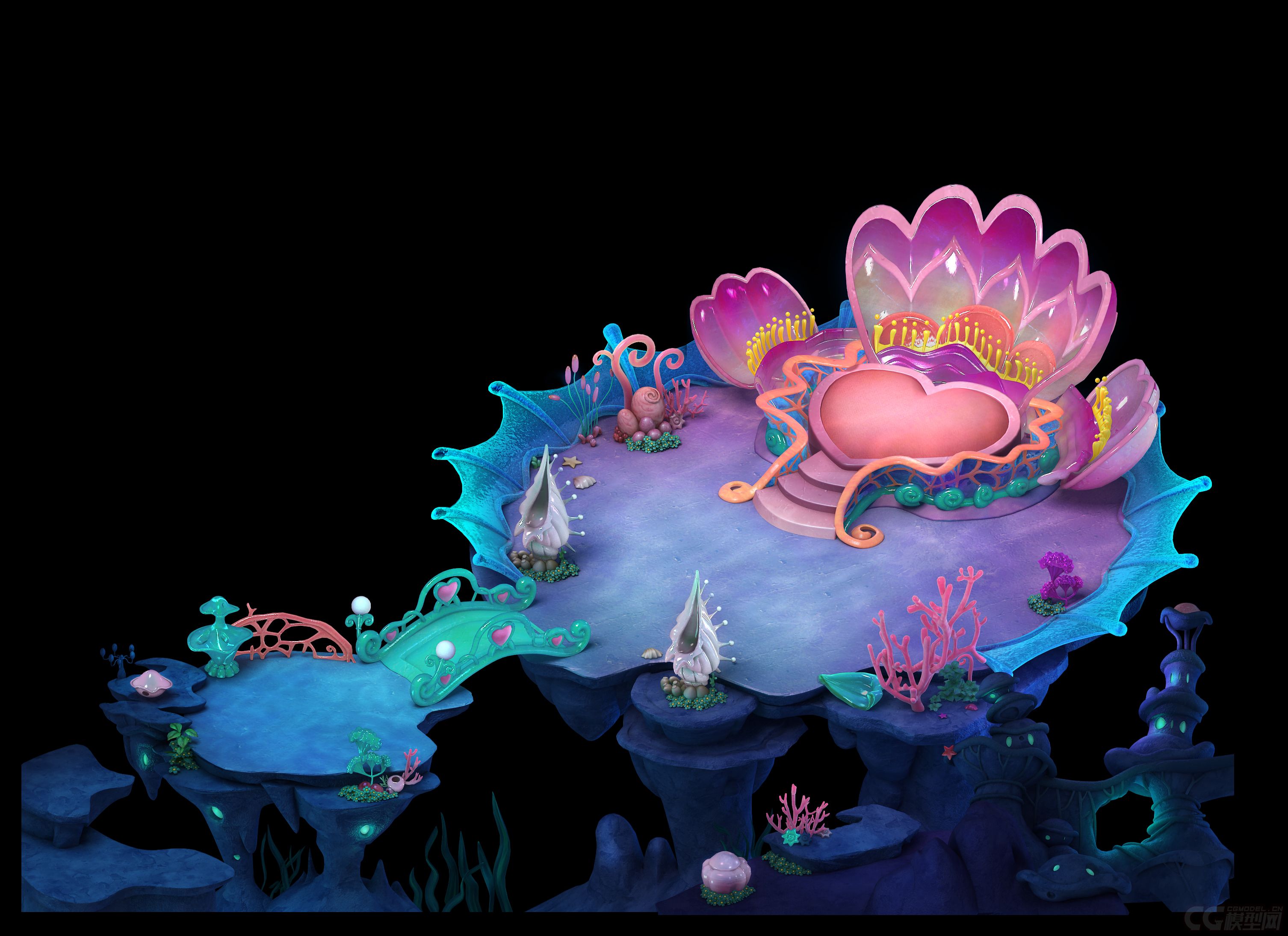 海域场景 海底龙宫 龙王宝座王座 贝壳座椅 珊瑚树 海草 珍珠 扇贝