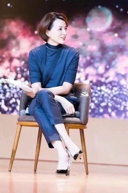 董卿节目花絮照蓝色连衣裙配短发优雅知性涂芭比粉气质好出众