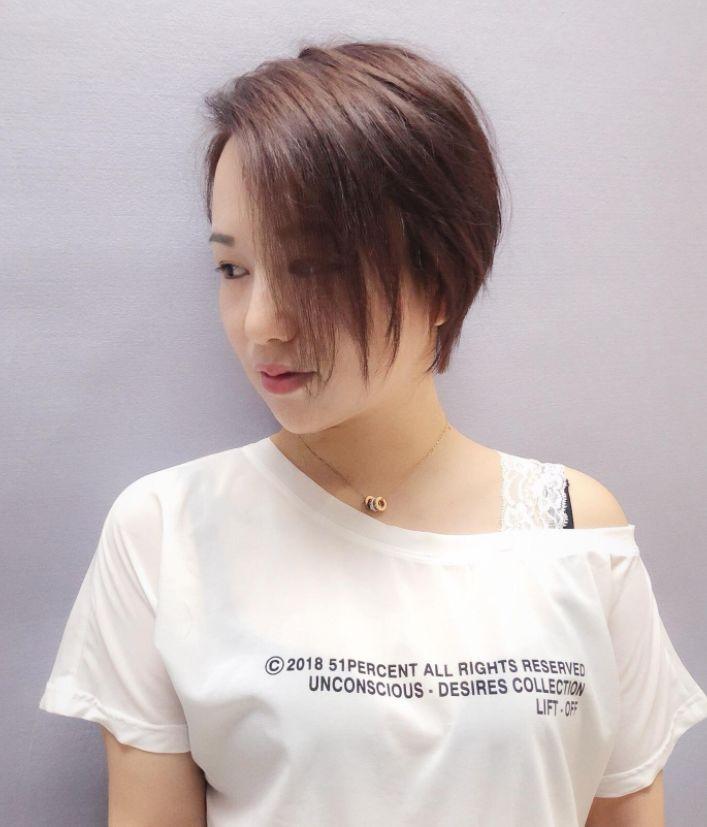 短发修剪的一边长,一边短不对称,这样的短发既有娇媚感又显得很干练