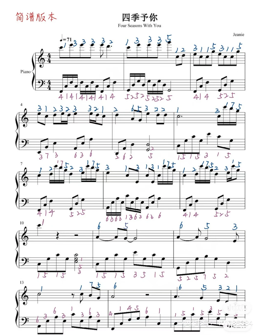 四季予你钢琴谱程响c调流行钢琴五线谱
