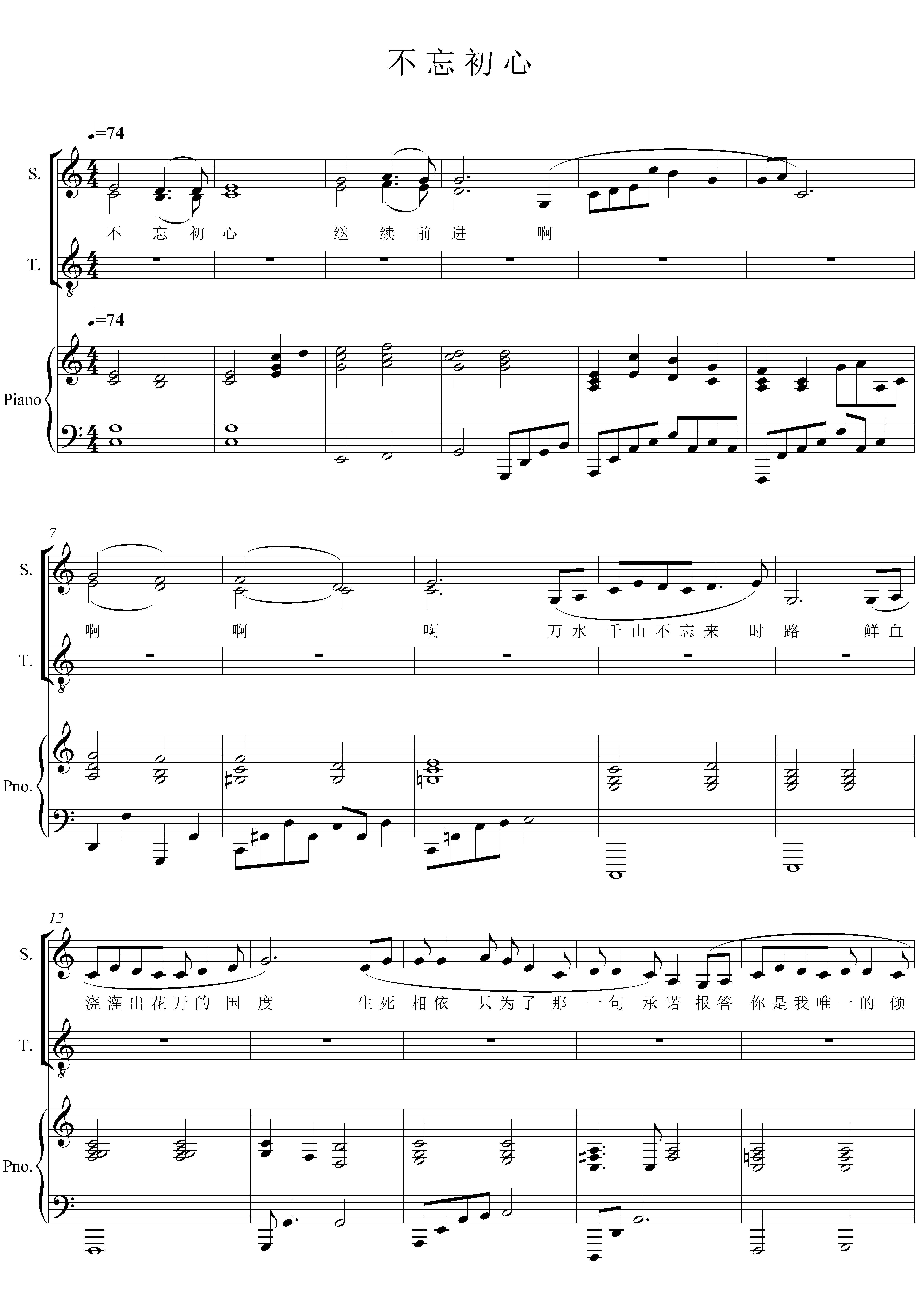 不忘初心 6页 钢琴伴奏谱 五线谱 移调正谱【二部合唱谱【c调