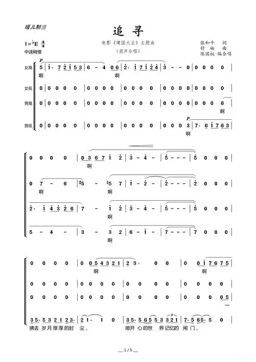 追寻四声部合唱 电影《建国大业》主题曲简谱1