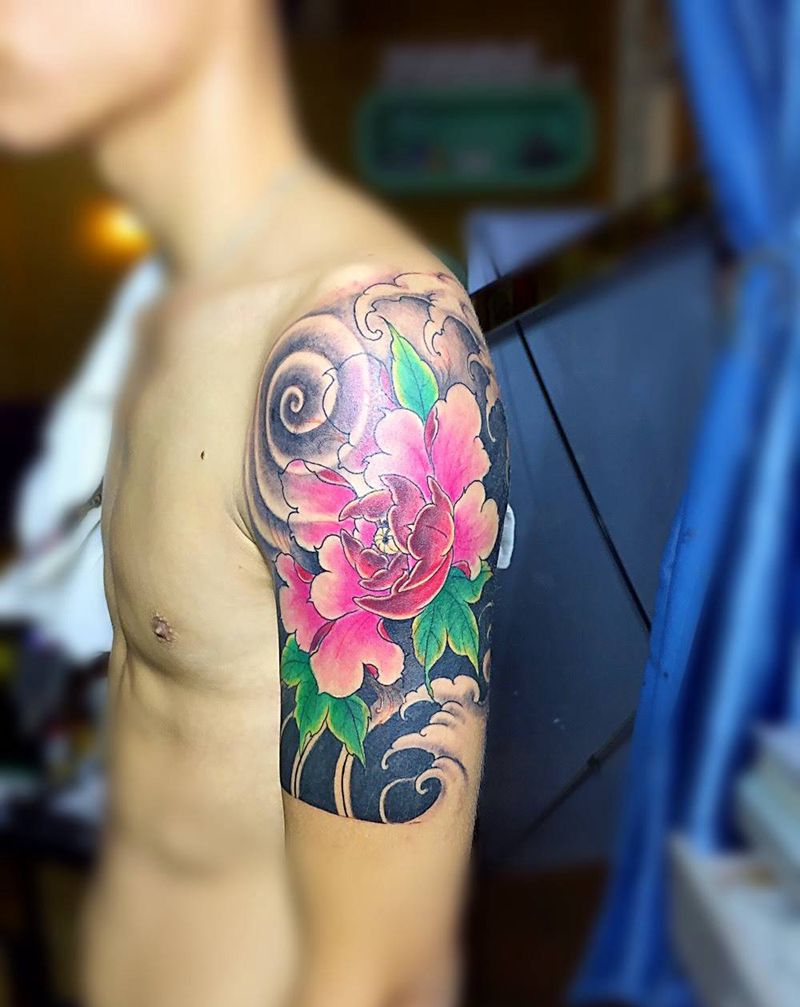 半肩艳彩牡丹花_纹身图案手稿图片_阿莫的纹身作品集
