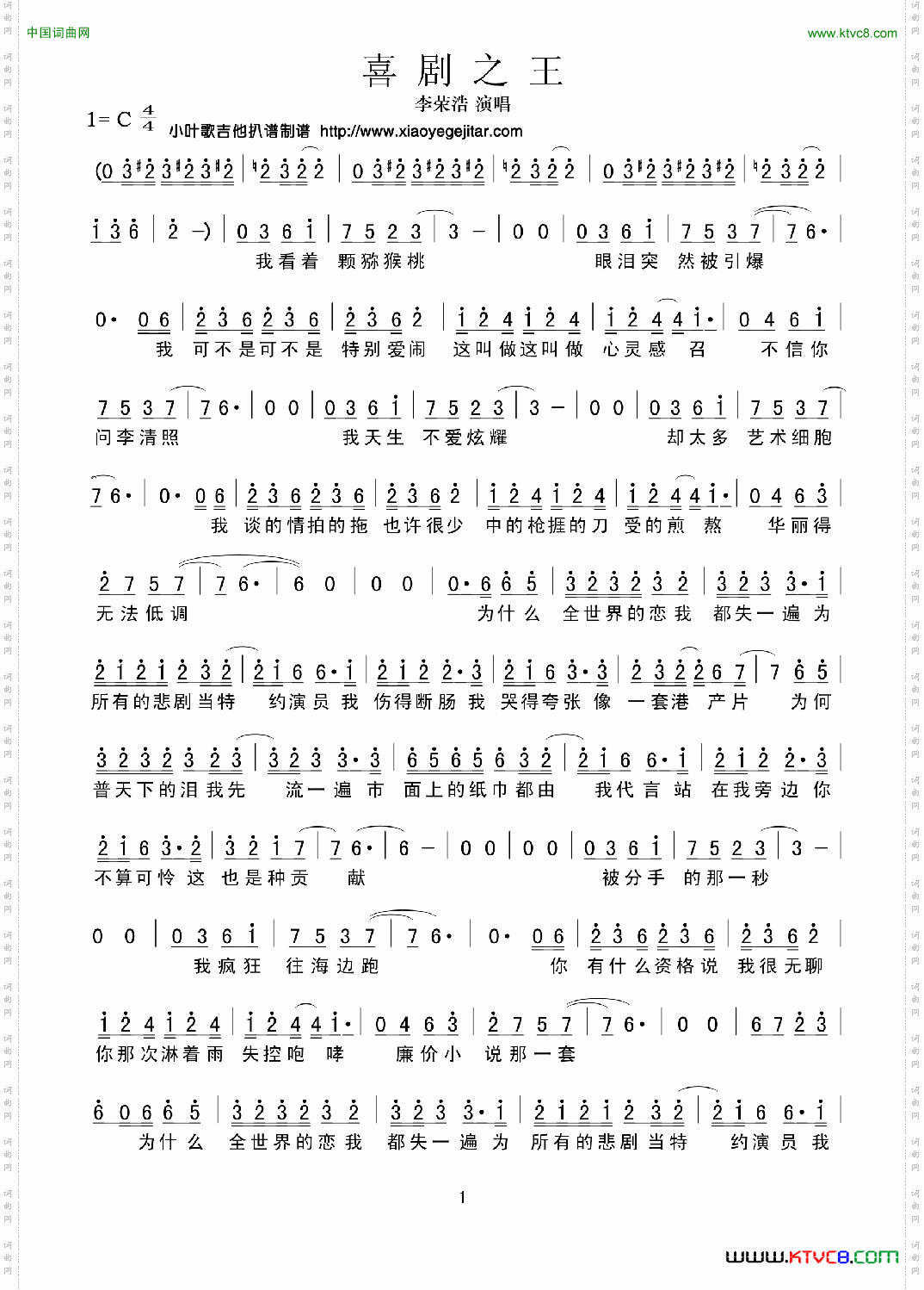 喜剧之王简谱(歌词)-李荣浩演唱-小叶歌曲谱1