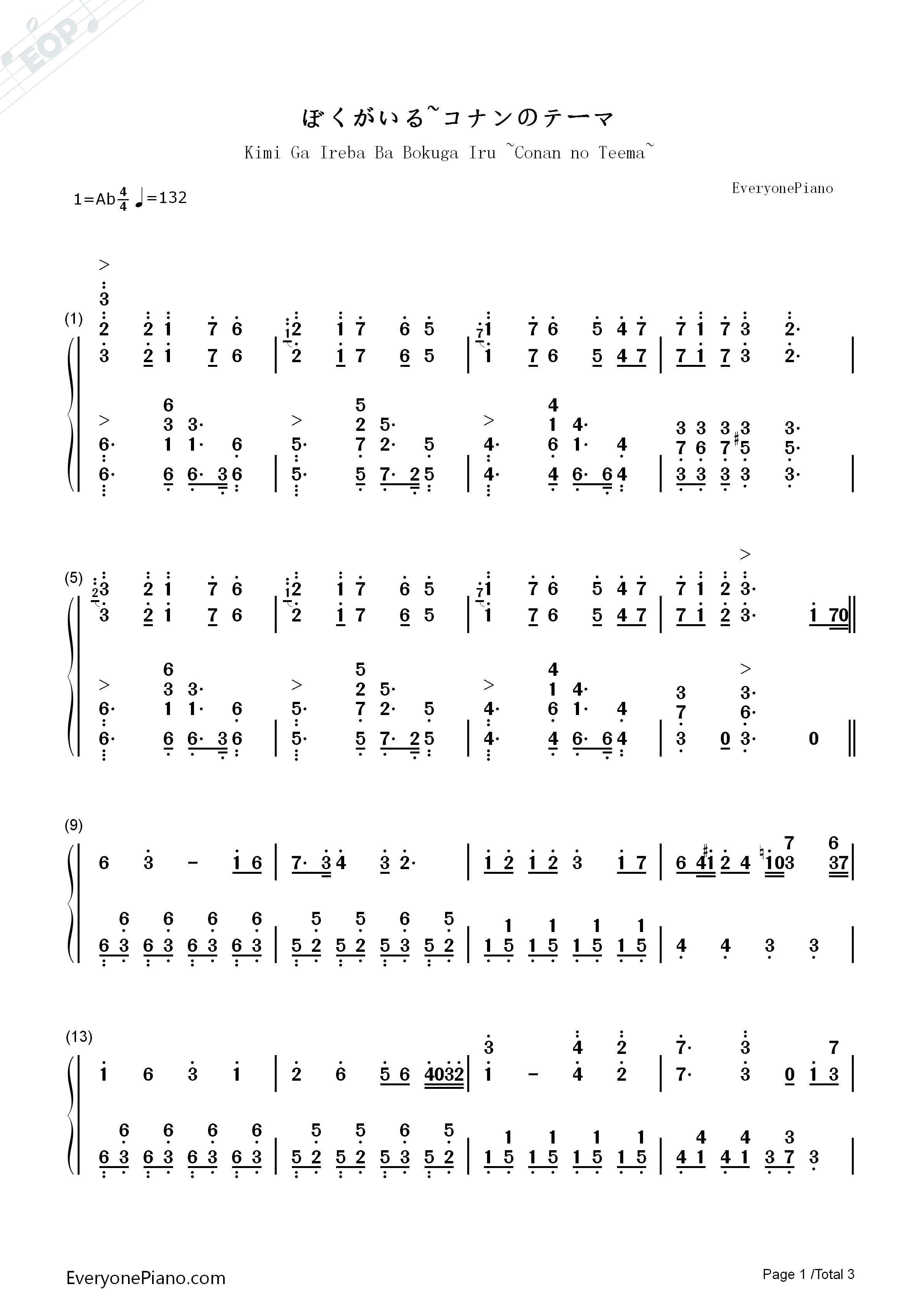 ぼくがいる~コナンのテーマ-名侦探柯南ost双手简谱预览1