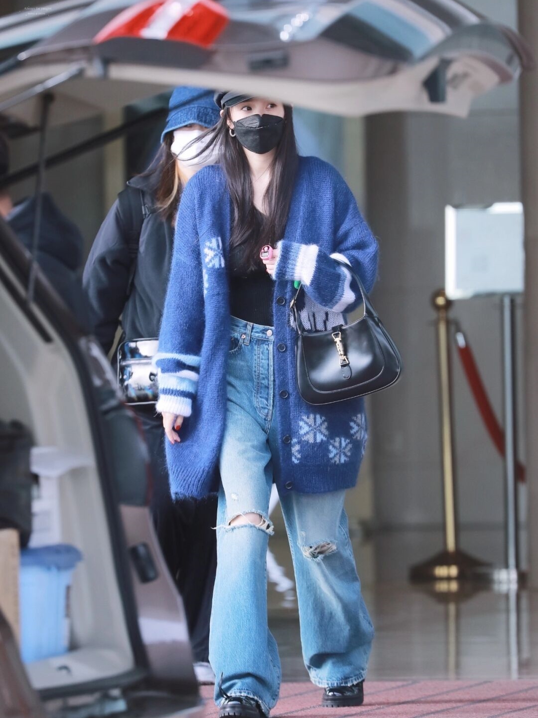 杨幂在机场的街拍中展示了她的私服风格,身穿蓝色针织衫搭配牛仔裤