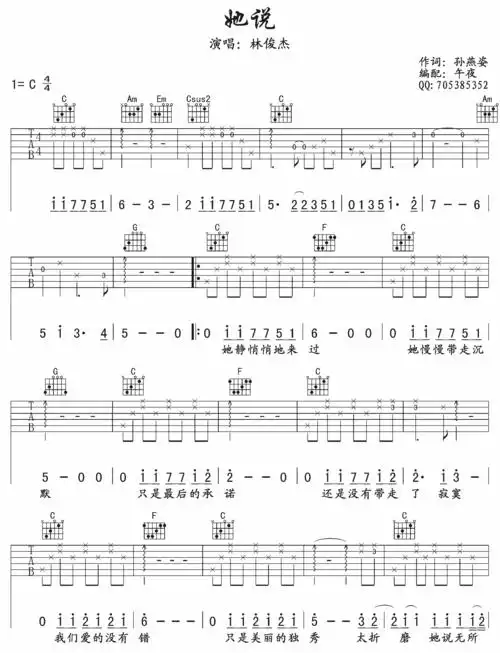 林俊杰她说吉他谱c调高清弹唱谱视频教学