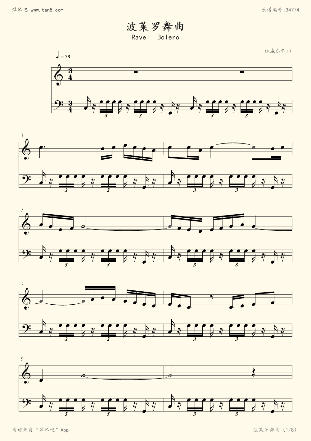 波莱罗舞曲钢琴谱拉威尔ravelc调流行钢琴五线谱